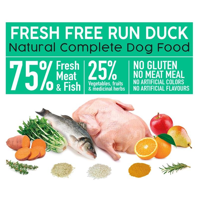 Popolna polsuha hrana za vse vrste odraslih psov, s 55% sveže race, 20% svežih rib in 25% zelenjave, sadja in zdravilnih zelišč.