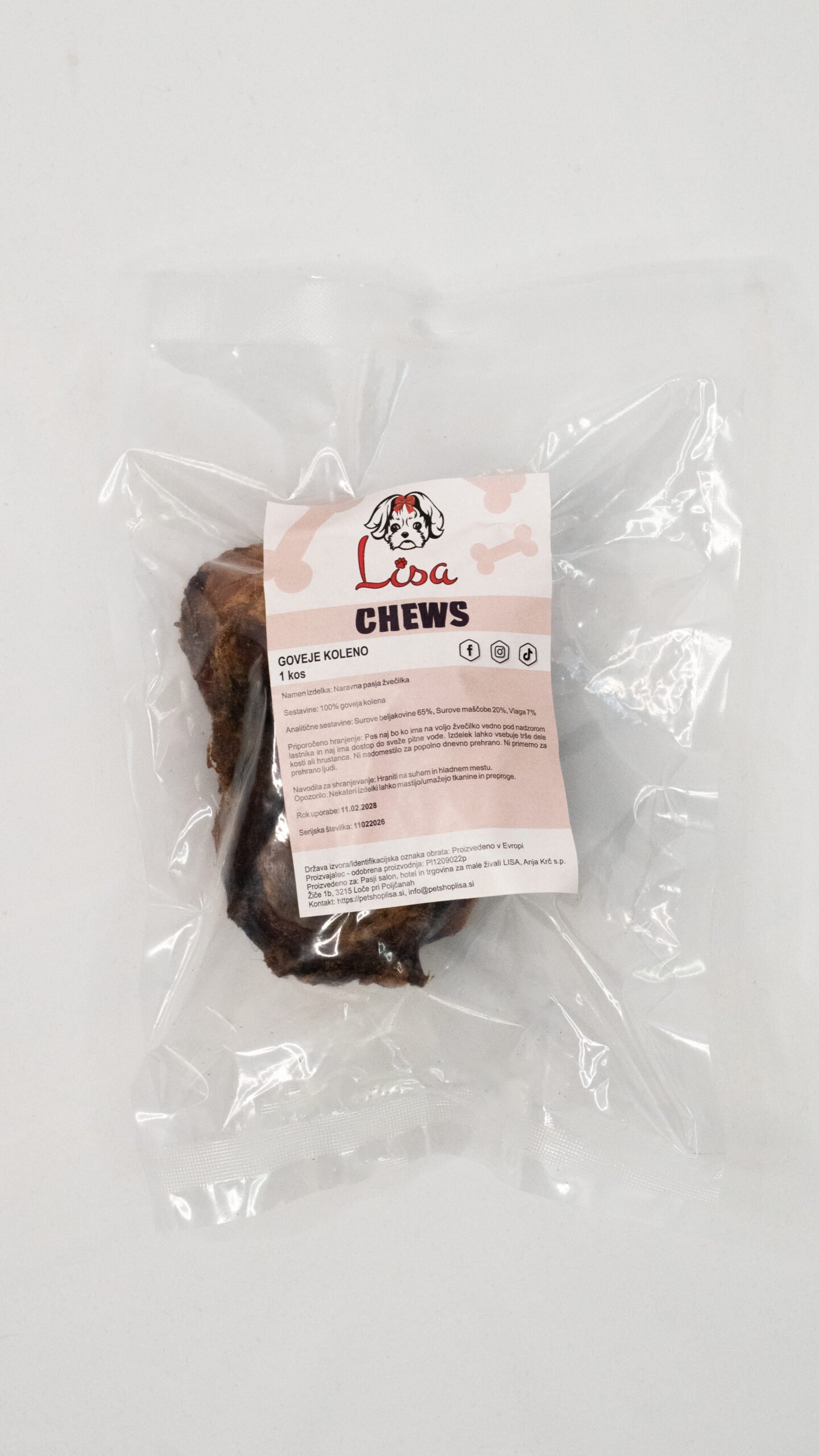 Goveje koleno je velika in zelo trpežna naravna žvečilka, ki je primerna predvsem za srednje velike in velike pse. Zagotavlja dolgotrajno zaposlitev ter spodbuja naravno potrebo psa po grizenju. Med žvečenjem pomaga mehansko odstranjevati zobne obloge ter krepi čeljustne mišice.