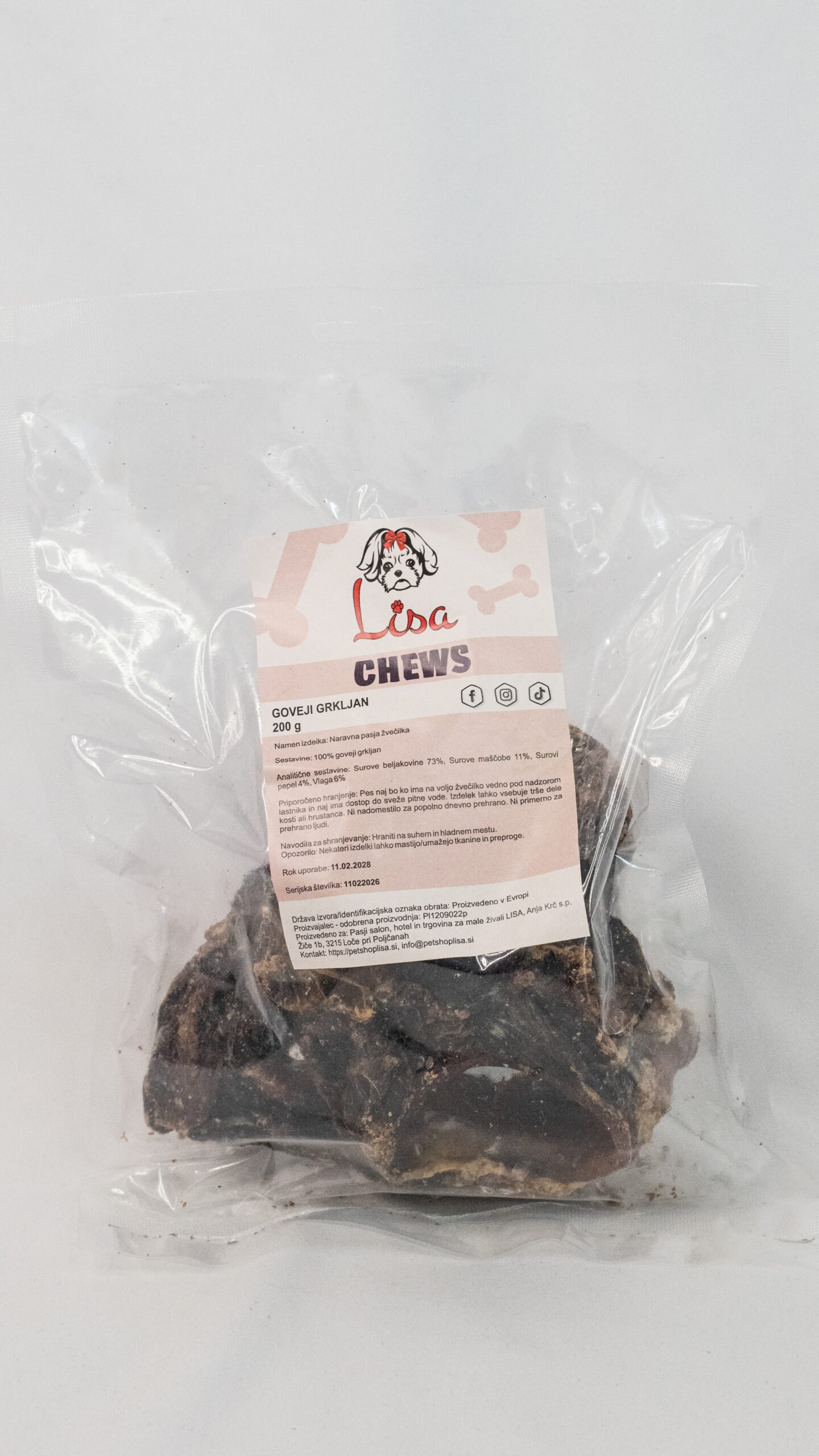 Goveji grkljan je naravna žvečilka z rahlo hrustljavo strukturo, ki psu ponuja okusno zaposlitev in naravno nagrado. Zaradi svoje sestave vsebuje tudi naravne spojine, ki lahko podpirajo zdravje sklepov. Primeren je za pse vseh velikosti ter predstavlja odlično kombinacijo žvečilke in priboljška.