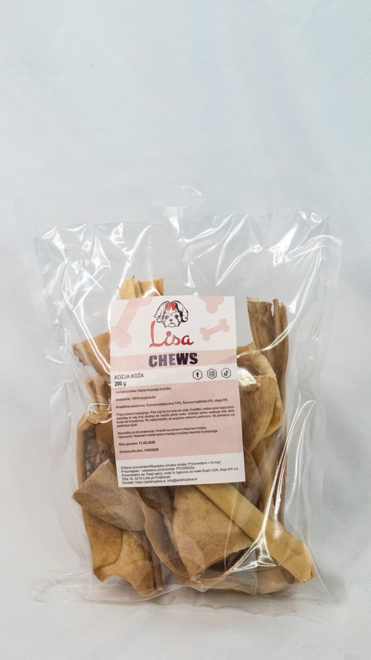 Kozja koža je trda in zelo obstojna naravna žvečilka, ki psu zagotavlja dolgotrajno zaposlitev. Med kožami velja za eno manj mastnih, zato je primerna tudi za pse z občutljivejšo prebavo. Žvečenje pomaga pri naravnem čiščenju zob, masaži dlesni in zadovoljevanju naravne potrebe po grizenju.