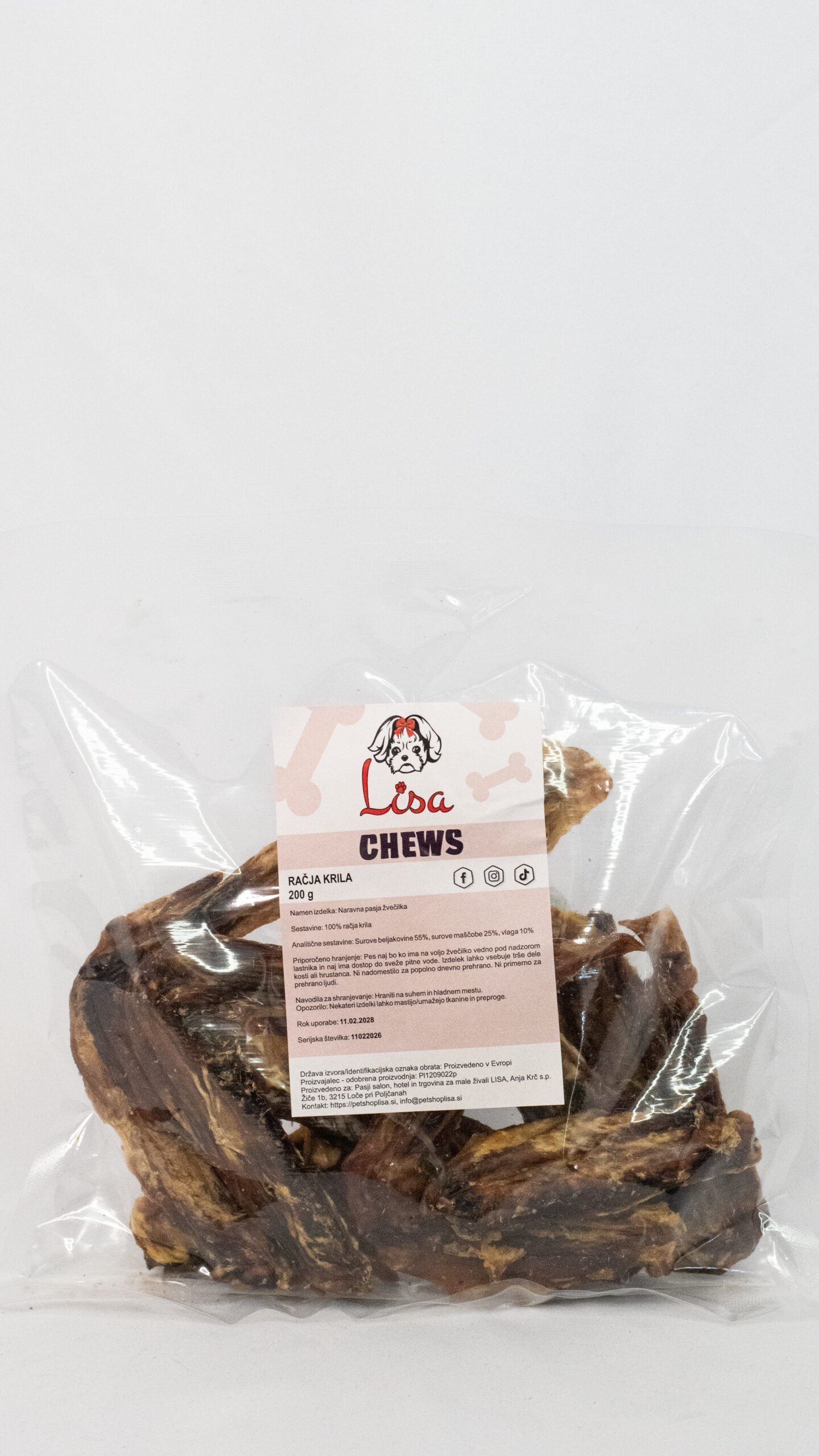 Račja krila so naravna in hrustljava žvečilka, ki vsebuje kosti in hrustanec. Žvečenje pomaga pri čiščenju zob ter zadovoljuje naravni nagon psa. Primerna za vse velikosti psov.