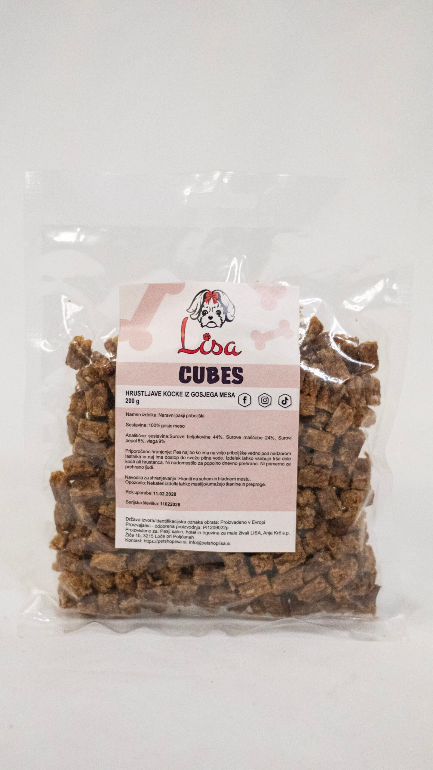 Hrustljave kocke iz gosjega mesa so okusna in aromatična nagrada za vašega psa. Zaradi priročne velikosti so primerne za treninge ali kot hitra poslastica med sprehodom. Gosje meso poskrbi za bogat okus, hrustljava tekstura pa za dodatno zadovoljstvo pri žvečenju.