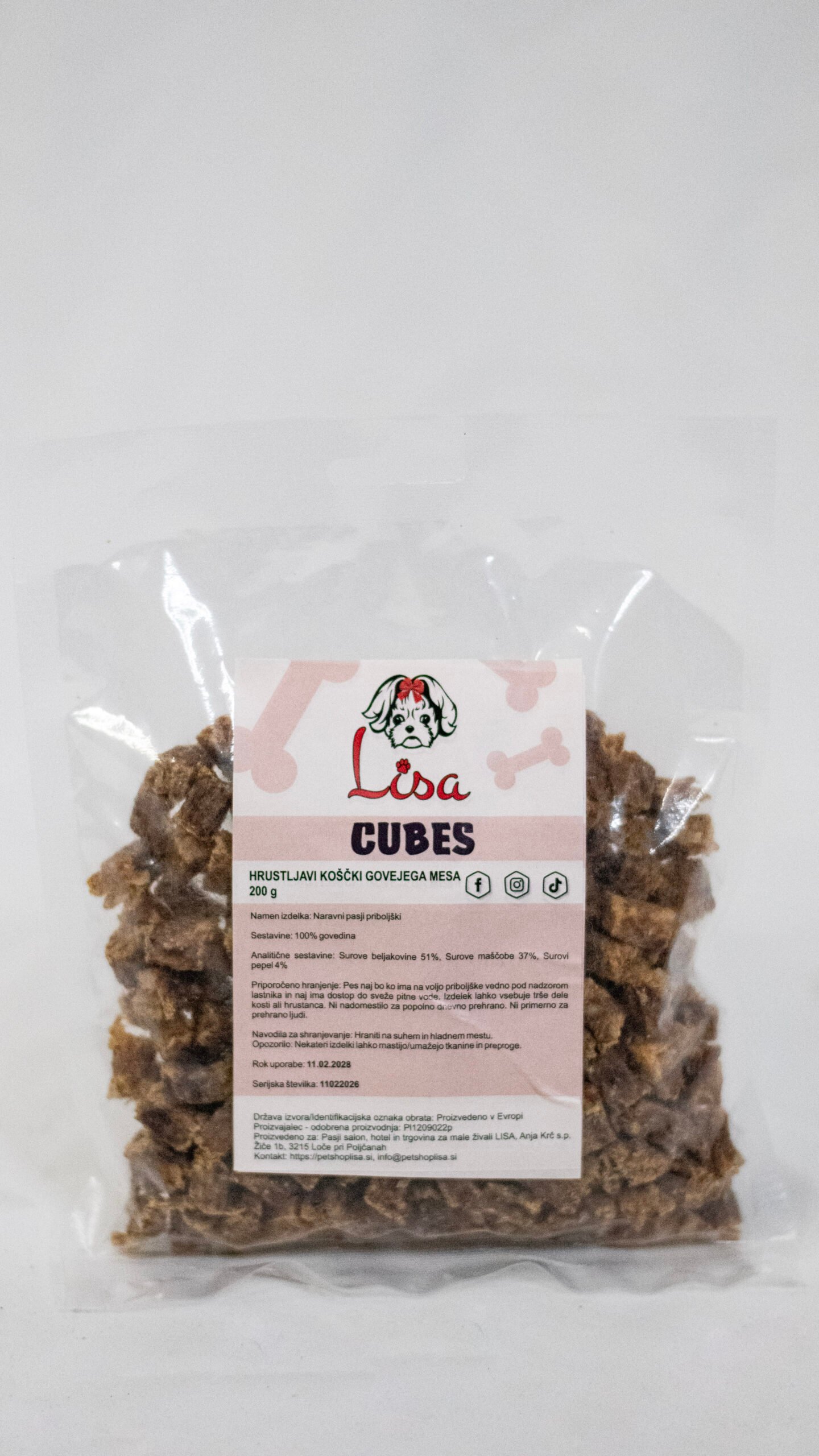 Koščki iz govejega mesa so aromatični in okusni naravni priboljški, ki jih psi obožujejo. Zaradi svoje mehkejše teksture so primerni kot nagrada pri treningu ali kot vsakodnevna poslastica. So bogat vir beljakovin in ne vsebujejo umetnih dodatkov.