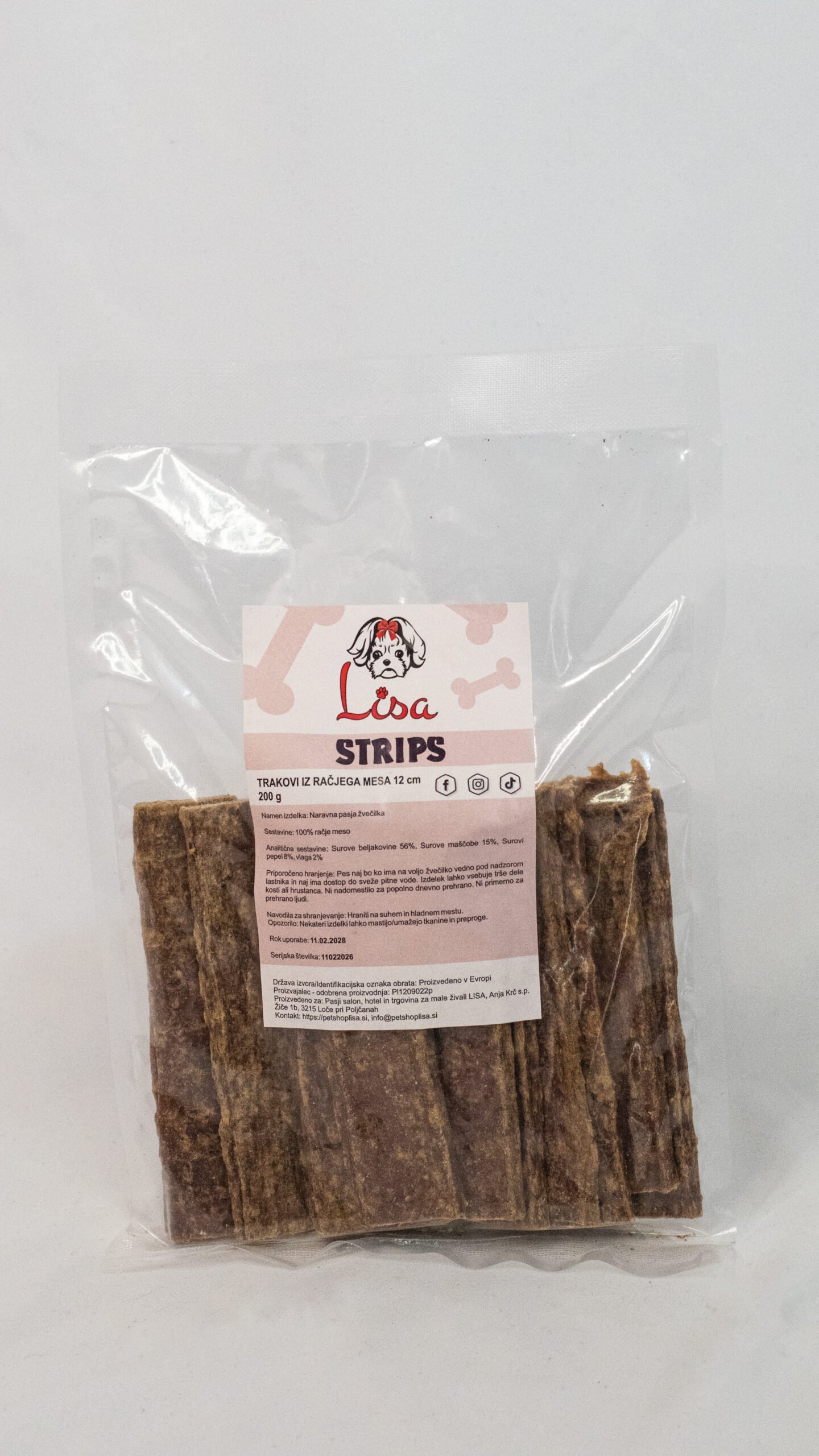 Trakovi iz račjega mesa so okusna in mehkejša nagrada, primerna za vsakodnevno razvajanje ali trening. Lahko jih prilagodite velikosti psa, saj se enostavno lomijo. Račje meso je aromatično in predstavlja dobro alternativo pogostejšim virom beljakovin.